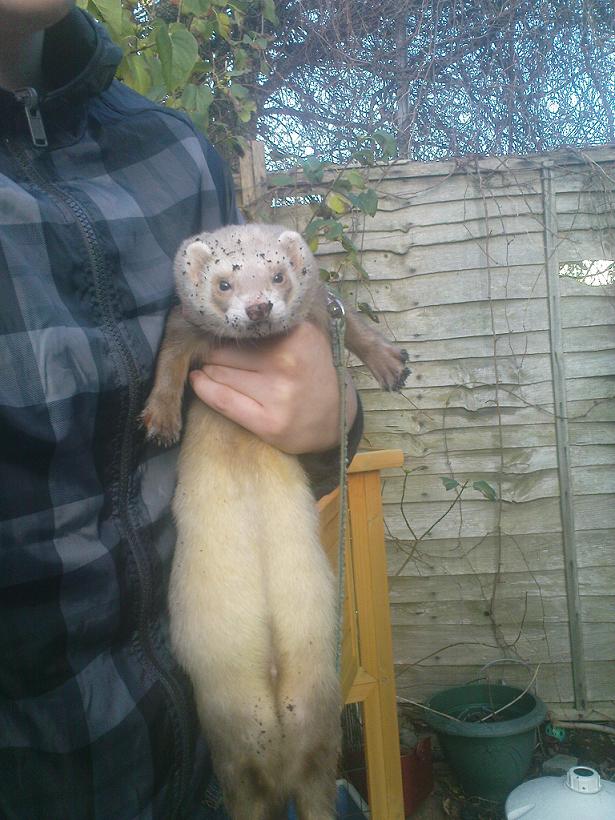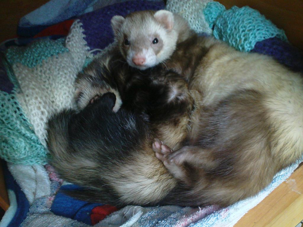 Tehehehe the ferrets are at mine tonight, just looked in the cage, the two of them are currently spooning in the hammock (have a really cute pic of them spooning another time, will post later). However they're too big to both be on it so Teddy is half hanging off, fast asleep, so cute