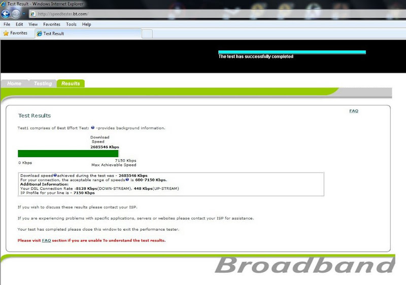 I'm not sure if I'm reading this correctly, so why don't you tell me how fast this connection of mine is aledgedly...  I think it's trying to claim that I have a 2,685 meg connection. I suspect that the BT speed tester is buggered
