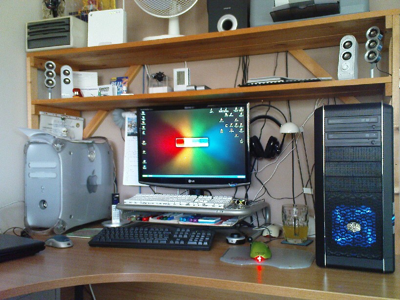 Awesome!  USB powered ferret  I'm sure I've done this befor (second post in fact), but anyway I've had a couple of upgrades since then...  In a nut Shell: Intel Core 2 Duo 3.0Ghz Motherboard by XFX 8Gb DDR2 by Crucial - I've maxed out the board, only ever seem to use 25% at most 9800 GTX+ Creative Labs X-Fi Gamer x2 Samsung 320GB SATA II 16mb cache x2 Samsung DVD RW 650 watt PSU by Corsair Case by Cooler Master. LG flatron 22" 16:10 (plugged into the DVI) Windows 7 (64 bit) Pro I still entertain the idear of upgrading the Mac some day  PS: Just realised the photo is a lie. the microsoft mouse has become a Razor Death Adder. And the Dell keyborad has been retiered for a Merc Stealth.