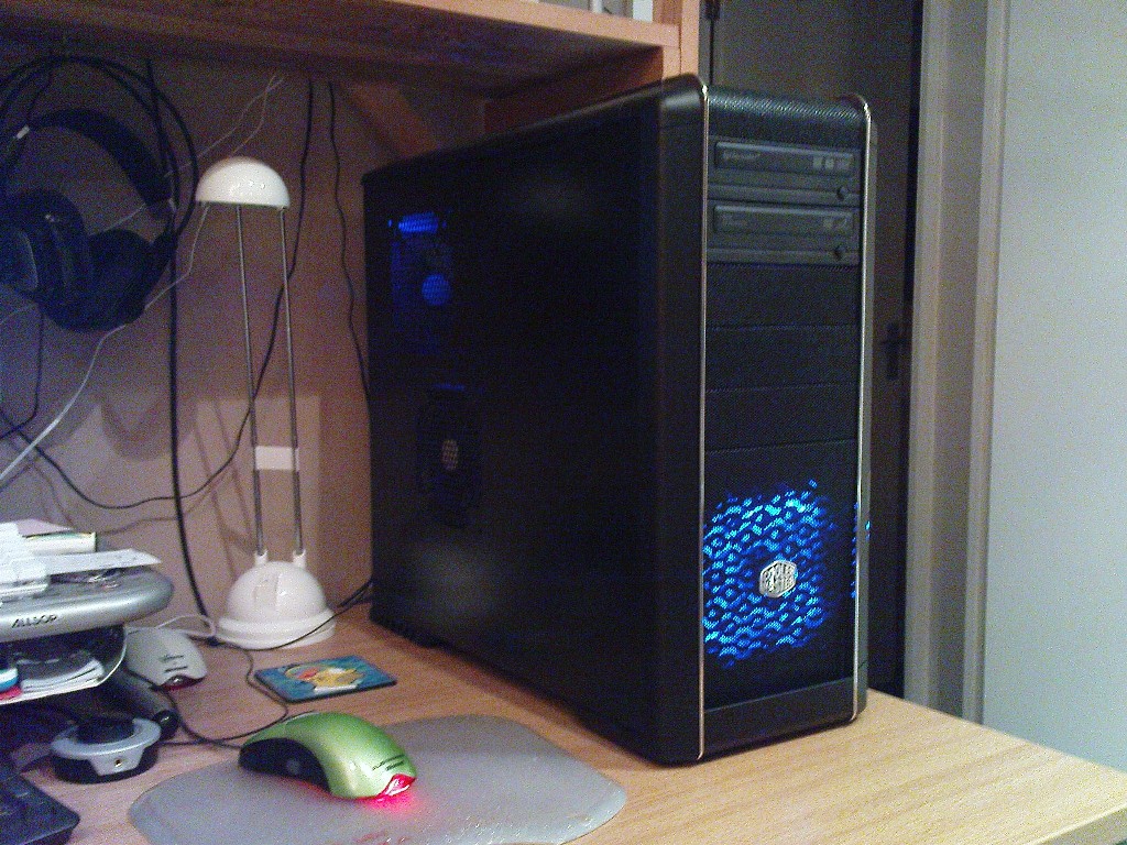 Black modded I-Cute case with 4 80mm blue fans and blue/violet cold cathode tubes.