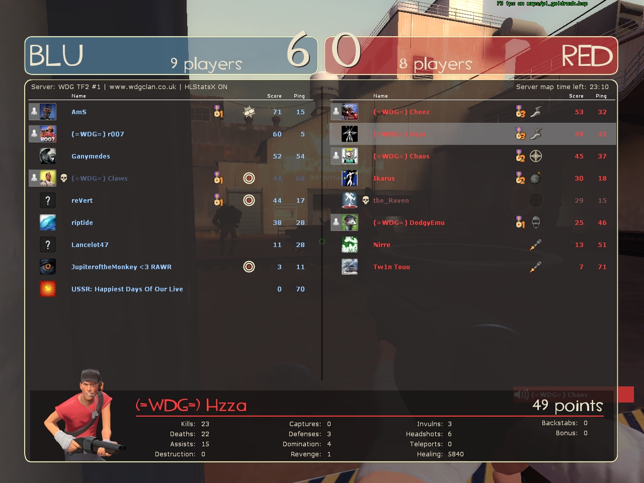 Most kills: DeadlyHaddock 32 Most deaths: DodgyEmu 22 (I hate you, snipercoward  ) Best KPD is 9, but I take a WDG-member: Hzza 7,5 Lowest KPD: =[IDK]=Blitzy 0,56 WDG-member: DodgyEmu 0,86