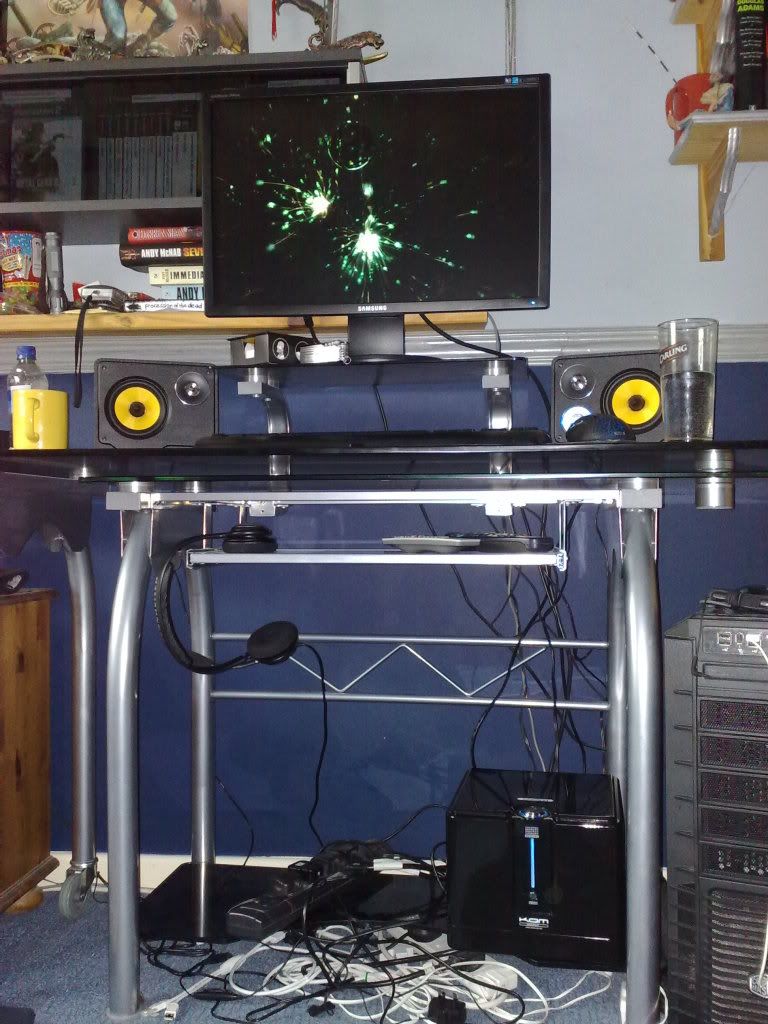 Vaguely left to right: The Trooper Poster Cabinent with knife collection Cabinent full of PS2 games Jelly beans Torch Old camera Pile of Andy Mcnab and Darren Shan books Bottle of water Recently emptied coffee mug KAM KPCS20 2.1 speakers Sennheiser 160 headset Notepaper Penknife Samsung 24" SyncMaster 2443nw Logitech G15 Keyboard Messy cabling TV and Sky Remote Logitech G9 mouse Pint o' water Mug with random crap Eddie figurine- Piece of Mind The Hitchhiker's Guide to the Galaxy The PC Ipod