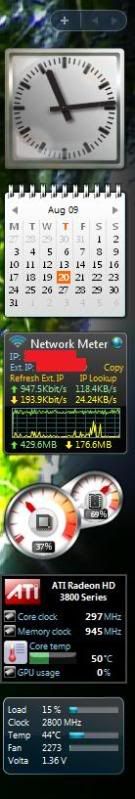 Err, CPU thingy, Weather thingy, Clock thingy and some thing I found that tells me what the CPU, fan, battery and network and RAM are doing. Can't find the one for getting a radar of all the loacl wireless points.