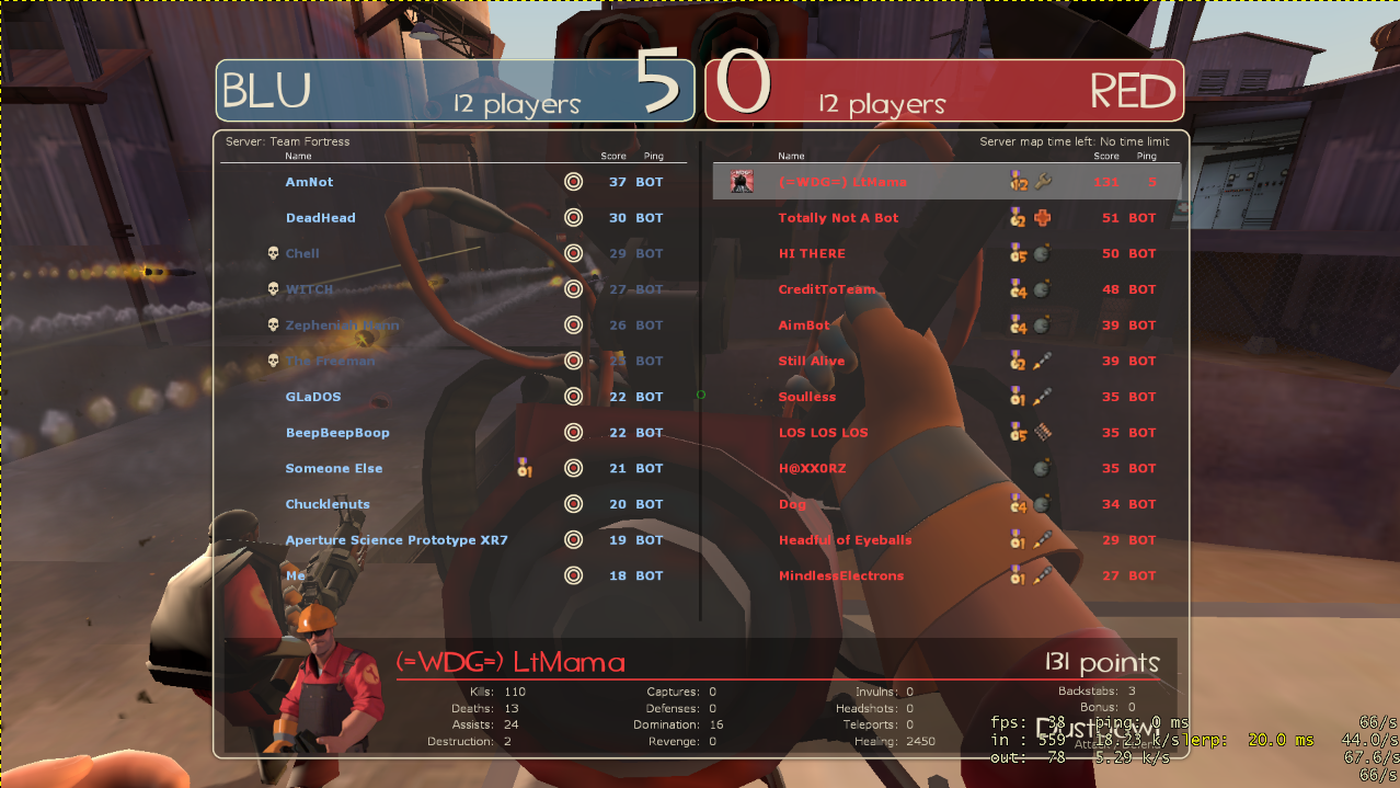 on the training mode dustbowl, the bots were massive fans of standing super still, i'm not sure if it needed to be that easy.