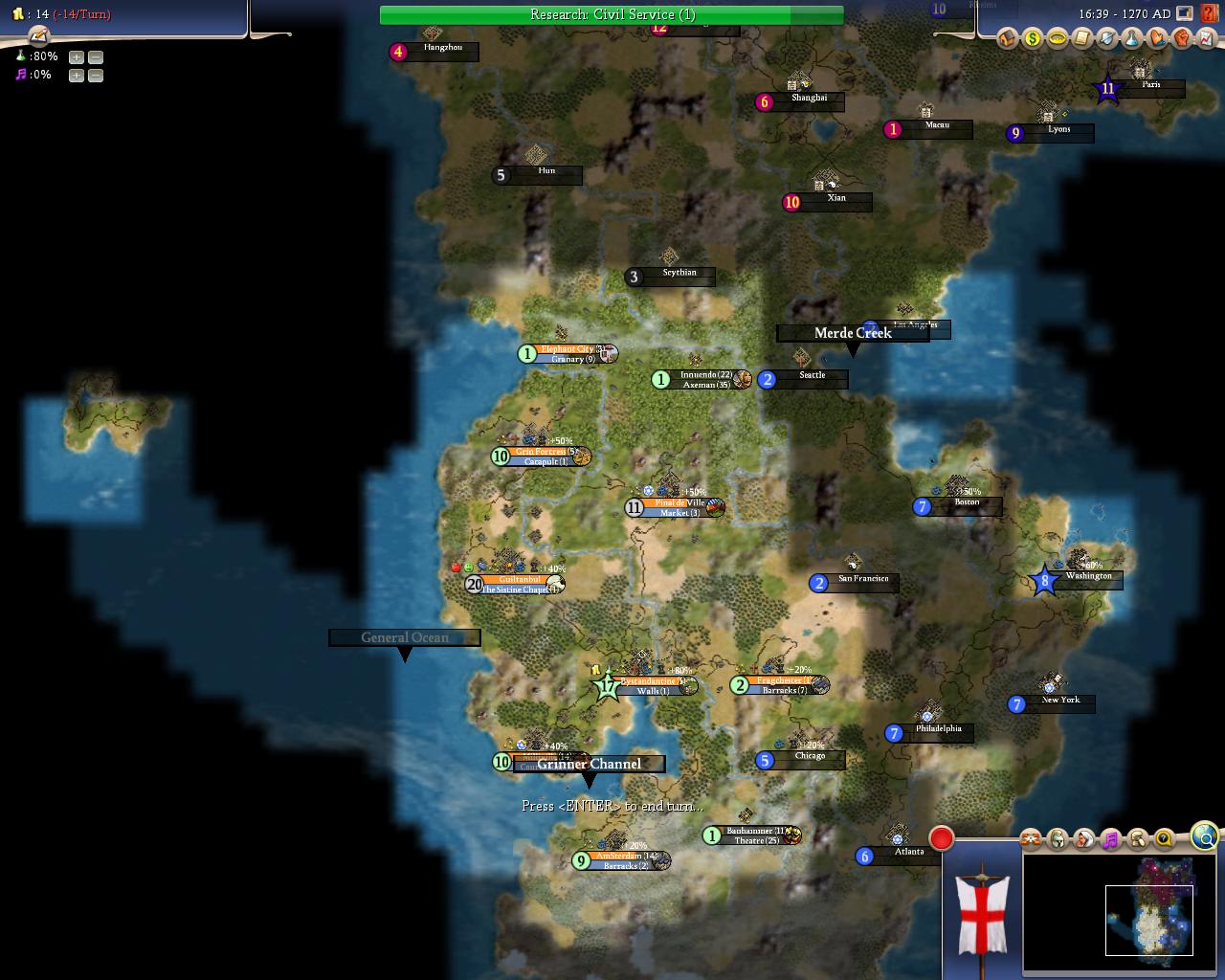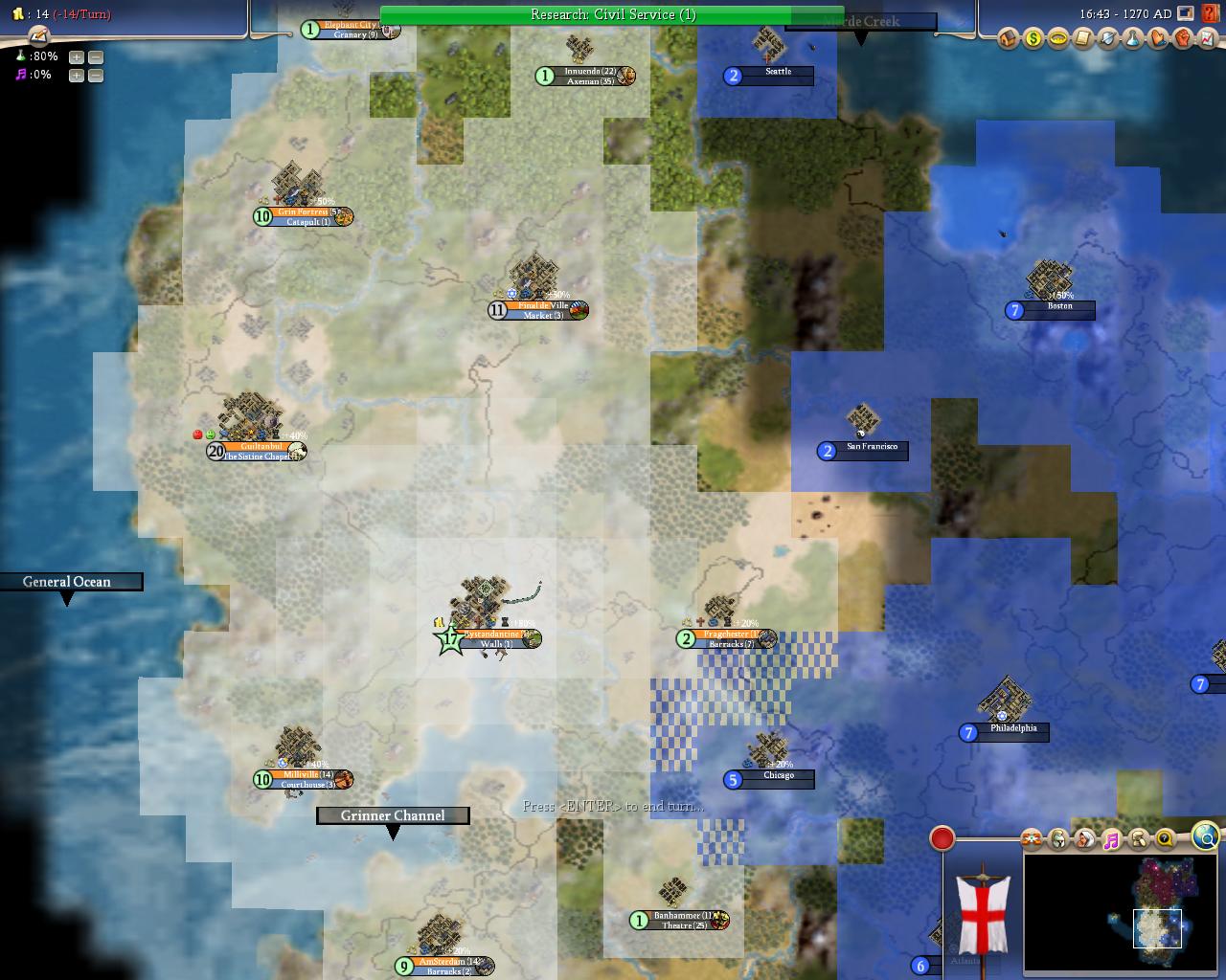 I built a lot of macemen so I think I might have doubled our military, built a load of wonders - tried not to upset anyone (not sure who we are going to take out first) and also managed to turn our bank balance around (~1000 coins / +30-40 a turn) and I finally founded a city to call my own Cheesy