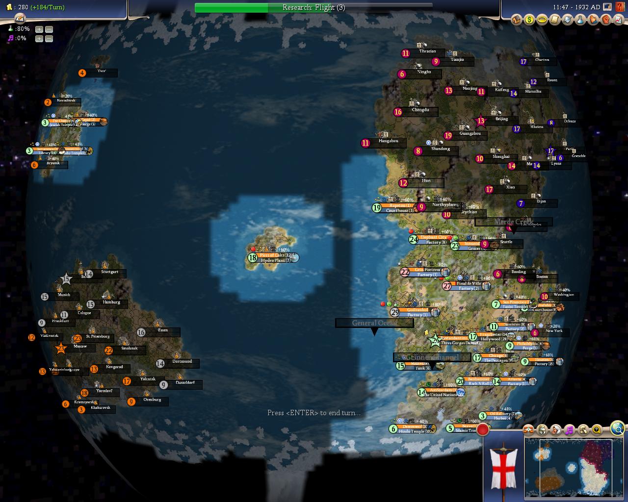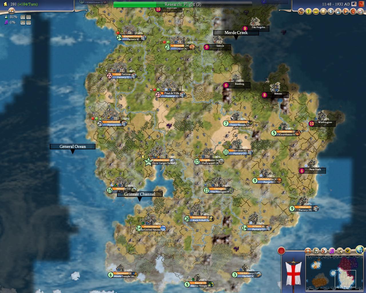 On turn 29 Mass Media is reseached and Flight is started, Bystandantine starts the 3 Gorges Dam and AmSterdam starts the United Nations.