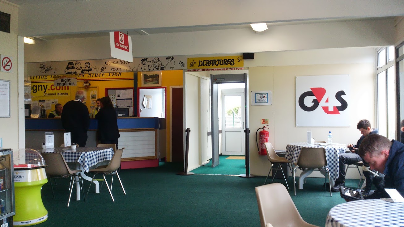 This is Tuesday afternoon at departures waiting to hitch a ride on the freight plane back to Guernsey.  You don't have to allow too long to get from check-in to the security gate!  The combined duty free and coffee shop didn't quite fit in the photo but their chilled food and drink cabinet on the left hand side and the plastic tables gives a hint of its magnificence.   Wink