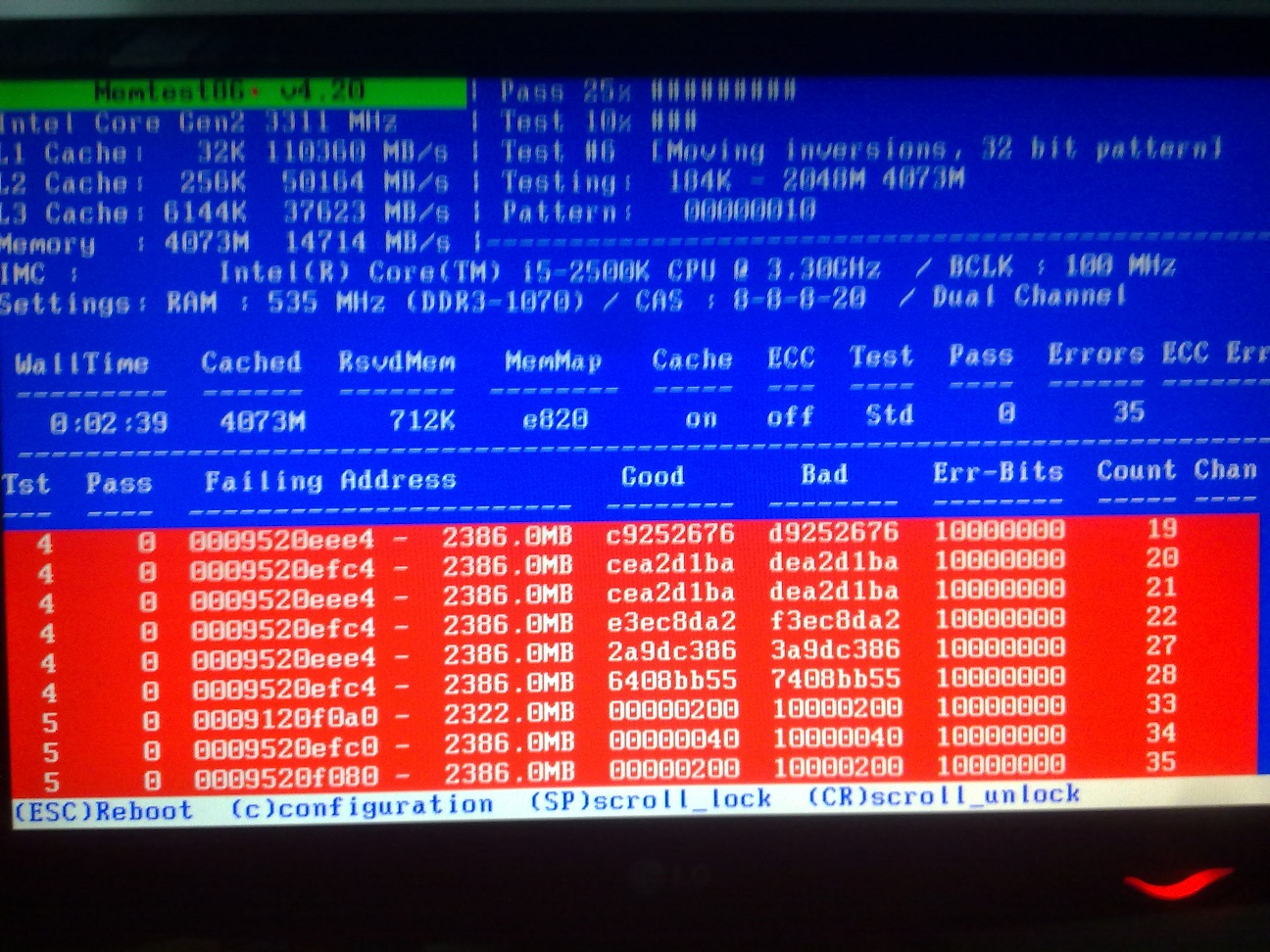 Just done a memtest and pretty much an all round solid fail. I have no idea what most of the stuff on the screen meant but it didn't look good: